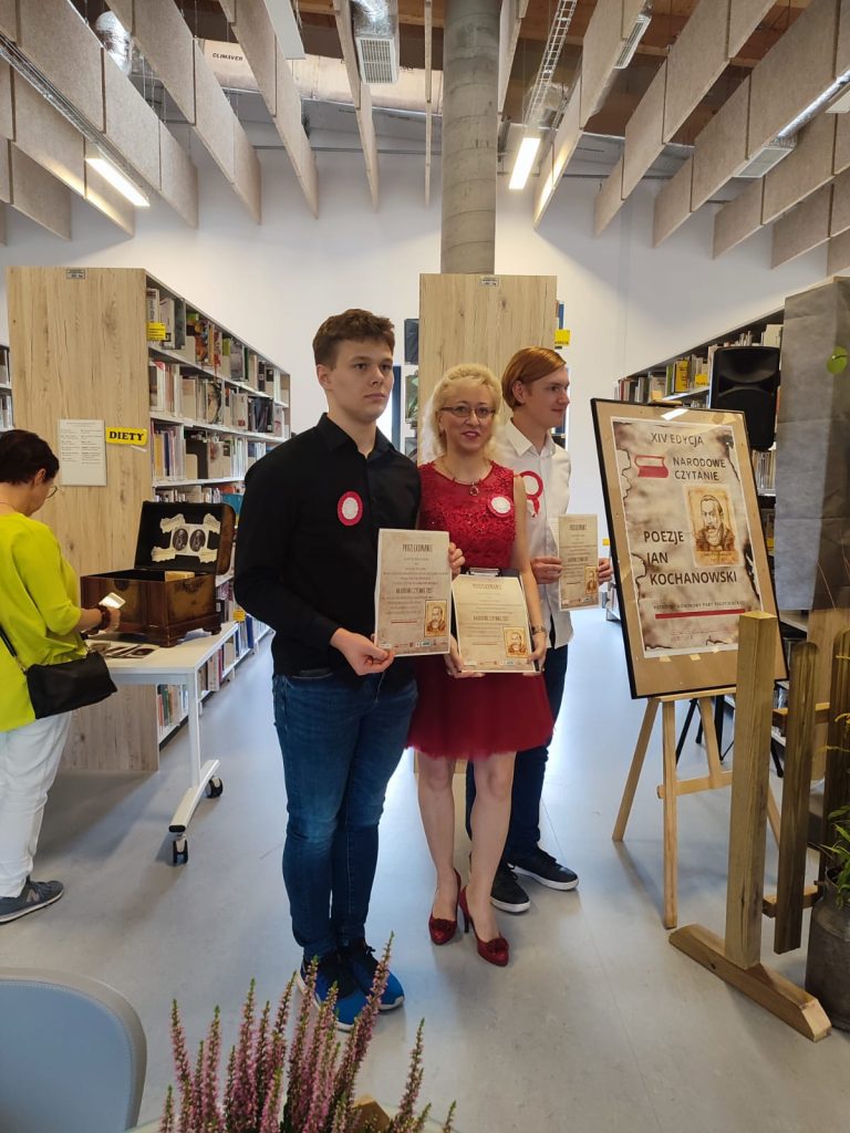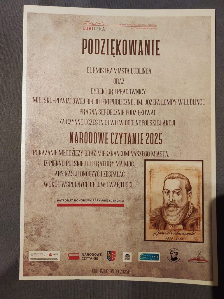 Narodowe Czytanie nieprzerwanie się rozwija i przynosi wiele przyjemności wszystkim jego współtwórcom i uczestnikom od 2012 roku. Podczas tegorocznej, czternastej edycji Narodowego Czytania, pani mgr Aleksandra Szokalska oraz uczniowie kl. 5Ta, kl. 4Ta, kl. 3Tb oraz kl. 1Tab, a także pani Anna Klimowicz oraz emeryci z Zespołu Szkół nr 1 im. Adama Mickiewicza w Lublińcu spotkali się w Lubitece, w sobotę 6 września 2025 roku, aby odkryć wyjątkowe przesłanie poezji Jana Kochanowskiego. Jan Kochanowski zaliczany jest do grona najwybitniejszych polskich poetów i największych twórców europejskich epoki renesansu. Urodził się w 1530 roku w Sycynie pod Zwoleniem. Studiował w Akademii Krakowskiej i na uniwersytecie w Padwie, w młodości podróżował po Europie. W 1559 roku powrócił do kraju i przyjął służbę dworzanina na dworach magnackich oraz na dworze królewskim. Kilkanaście lat później osiadł na stałe w dziedzicznym majątku w Czarnolesie, poświęcając się pracy pisarskiej. W tym okresie kontynuował pisanie pieśni i fraszek. Po śmierci ukochanej córki, Urszulki, opublikował cykl Trenów – arcydzieło literatury staropolskiej. Kochanowski zmarł nagle w 1584 roku w czasie obrad sejmu w Lublinie, został pochowany w krypcie zwoleńskiego kościoła.Poezja Jana Kochanowskiego porusza różnorodne tematy – od poważnych i doniosłych po lżejsze i żartobliwe. Opisuje życie dworskie i ziemiańskie, pojawiają się w niej wątki patriotyczne, refleksje moralne, nawiązania antyczne i biblijne. W wierszach odnajdziemy humanistyczną religijność, zachwyt życiem, ale też głęboką zadumę nad przemijaniem i ludzkim losem. Artysta przyczynił się do rozwoju polskiego języka literackiego, a jego niezrównane dzieła do dziś pozostają żywe i nadal inspirują.Podstawowym celem Narodowego Czytania jest popularyzacja czytelnictwa, zwrócenie uwagi na bogactwo polskiej literatury, potrzebę dbałości o polszczyznę oraz wzmocnienie poczucia wspólnej narodowej tożsamości. Poseł na Sejm Przemysław Witek, przedstawiciele władz Powiatu i Miasta, Radni, Bibliotekarze, Nauczyciele oraz artyści Zespołu Pieśni i Tańca „Halka” w Lublińcu wspólnie czytali poezję Jana Kochanowskiego. „Poezja Jana Kochanowskiego towarzyszy nam od pokoleń. Głęboka, napisana wspaniałą polszczyzną opowiada o czasach dawnych, ale przecież bez trudu odnajdziemy w niej samych siebie – współczesnych Polaków” – zaznaczył Prezydent RP, zapraszając do wspólnej lektury.„Jest w tych utworach radość i smutek. Jest pocieszenie i wielka pochwała życia” – przypomniała Pierwsza Dama, zachęcając do odkrywania na nowo fraszek, pieśni i trenów Mistrza z Czarnolasu.Prezydent podkreślił także, że w utworach Jana Kochanowskiego zawarta jest mądra refleksja o Polsce – troska o dobro wspólne i pomyślność Rzeczypospolitej.„Ja i moja Małżonka czytamy i będziemy czytać polskie lektury. To powinno być nasze wspólne wielkie zadanie, by uczeń wychodzący z polskiej szkoły rzeczywiście czuł dumę z bycia Polakiem” – podkreślił Prezydent. Podczas Narodowego Czytania 2025 polonistka mgr Aleksandra Szokalska czytała fragmenty poezji Jana Kochanowskiego wraz z Szymonem Jasińskim oraz Pawłem Matuskiem.Młodzież pod opieką mgr Aleksandry Szokalskiej poznała wyjątkowe dzieło, które pozwoliło każdej uczennicy i każdemu uczniowi włączyć się i współtworzyć ogólnopolską akcję, która popularyzuje czytelnictwo i niezmiennie udowadnia, że piękno polskiej literatury ma moc, aby nas jednoczyć i zespalać wokół wspólnych celów i wspólnych wartości. Wspólna lektura utworu na nowo ukazała polską literaturę i wzbogaciła jubileuszowe obchody o ważną refleksję nad naszą kulturą i historią. Szczególne podziękowania należą się następującym uczennicom i uczniom: Szymonowi Jasińskiemu, Pawłowi Matuskowi, Magdzie Baron, Maciejowi Mnichowi, Szymonowi Wręczyckiemu, Ignacemu Majczynie, Sebastianowi Petlakowi i Zuzannie Pacudzie.