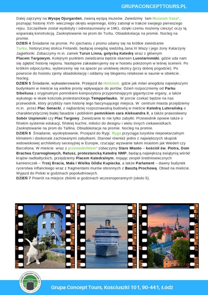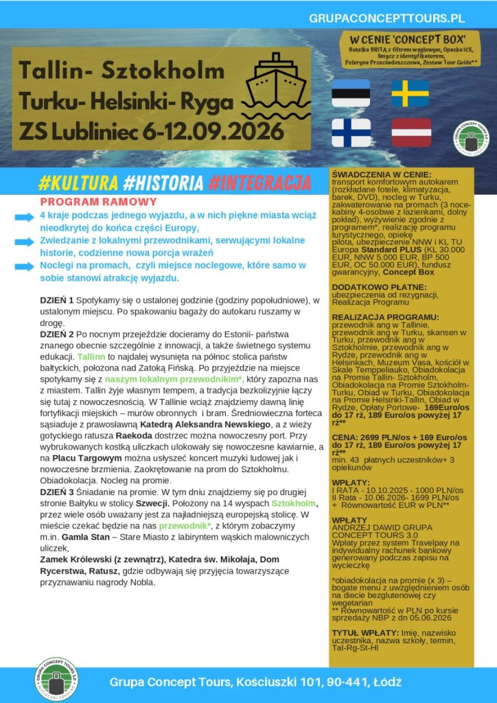 W najbliższy piątek 3 października 2025 r. startują zapisy na wycieczkę szkolną aż do czterech krajów: Łotwy, Estonii, Finlandii i Szwecji. Wycieczka odbędzie się od 6 do 12 września 2026 r. (+/- 2 dni rozpoczęcie/zakończenie).To niesamowita szansa nie tylko na integrację, ale również na poznanie innych kultur i praktyczną naukę języka angielskiego.