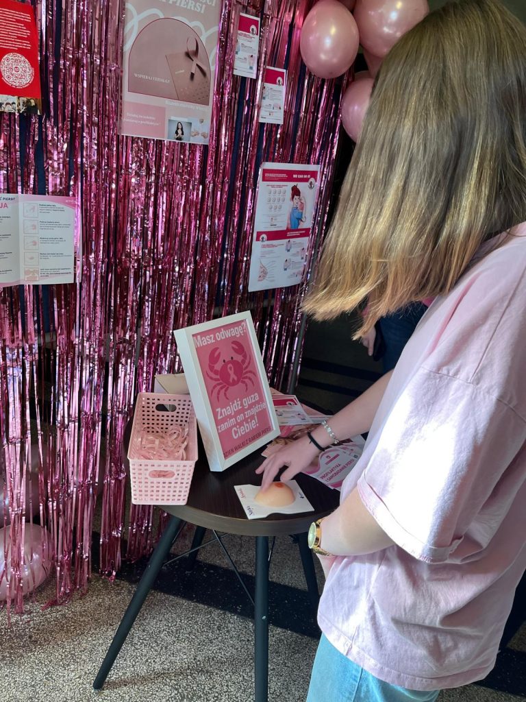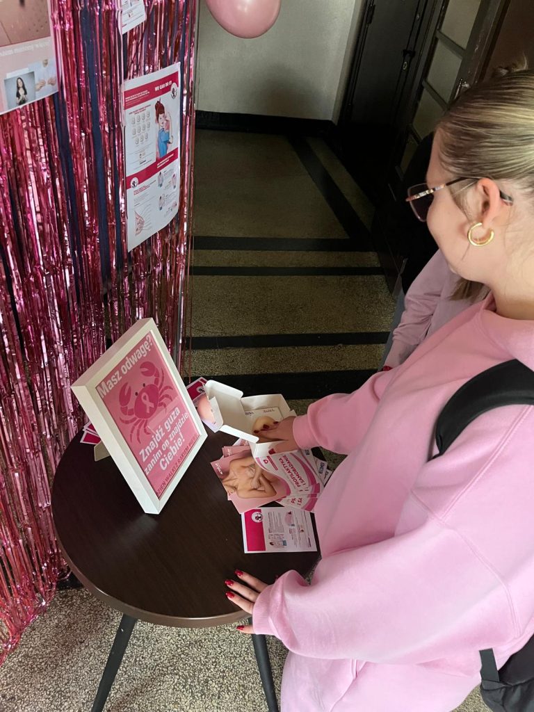 Uczniowie mieli okazję poszerzyć swoją wiedzę na temat profilaktyki raka piersi oraz w praktyczny sposób nauczyć się, jak rozpoznawać niepokojące zmiany – dzięki specjalnemu fantomowi do nauki samobadania. Takie doświadczenie uświadamia, jak wielkie znaczenie ma wczesne wykrycie choroby i regularne dbanie o zdrowie.