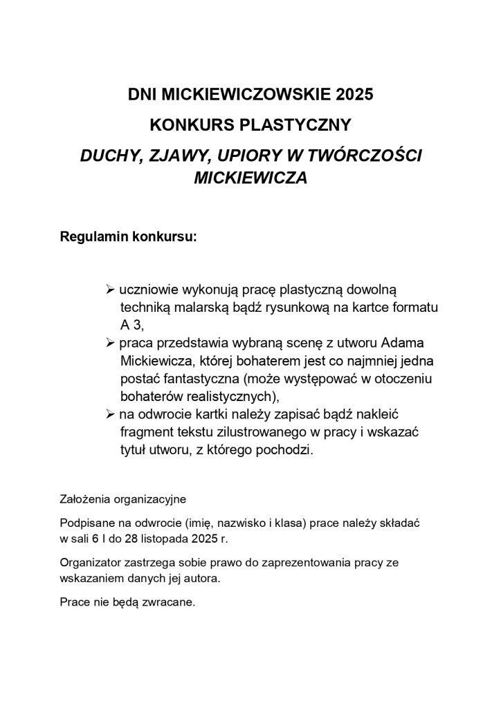 W tegorocznym programie przewidziano różnorodne konkursy, w których każdy uczeń może znaleźć przestrzeń do zaprezentowania swoich umiejętności. Rywalizacja obejmuje działania plastyczne, recytatorskie oraz sprawdzające wiedzę o życiu i twórczości Mickiewicza. Konkursy, odbywające się w przyjaznej atmosferze, umożliwiają rozwijanie pasji i kreatywności oraz sprzyjają poznawaniu literatury w atrakcyjny, angażujący sposób.