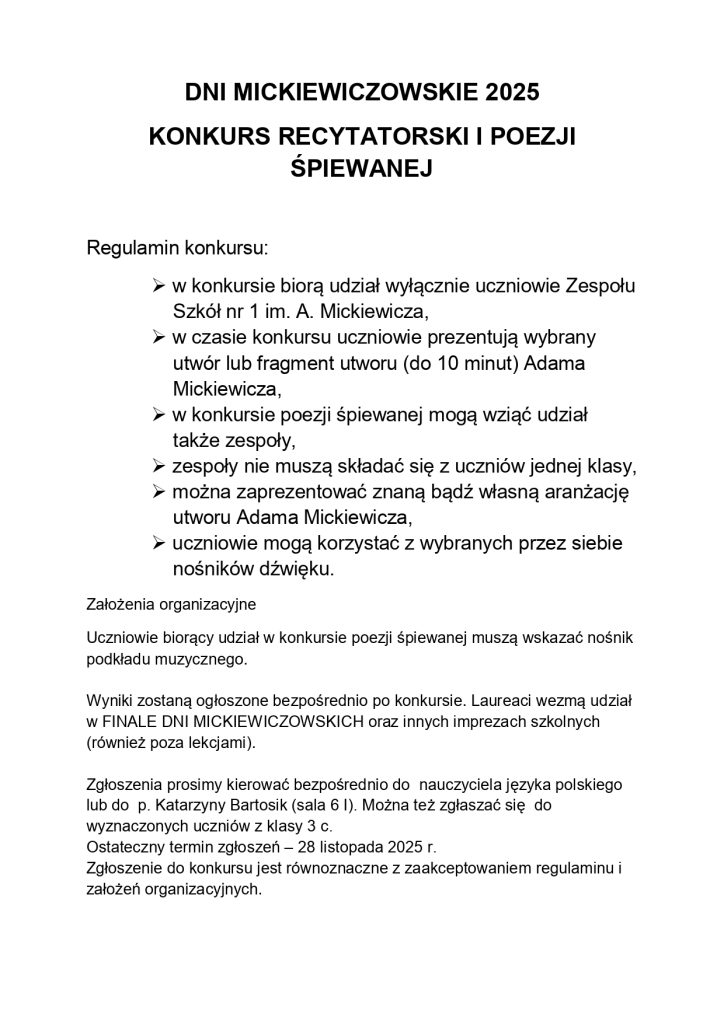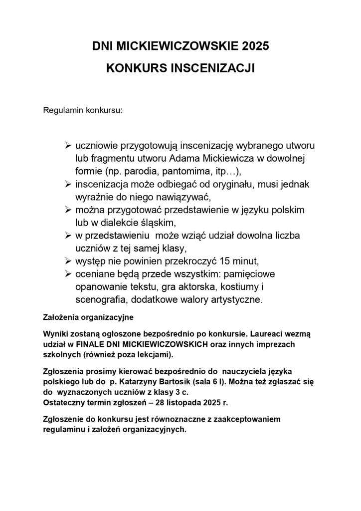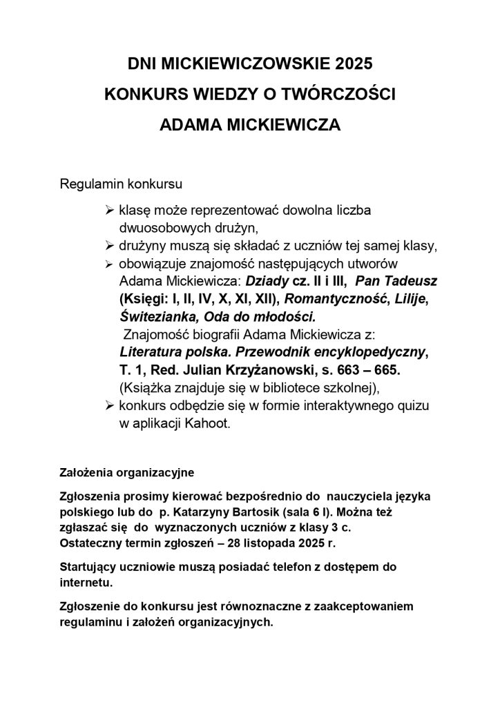 Zgłoszenia do udziału w konkursach przyjmują nauczyciele języka polskiego do 28 listopada 2025 r. Udział w Dniach Mickiewiczowskich to nie tylko okazja do zdobycia doświadczenia i doskonalenia swoich umiejętności, ale także możliwość aktywnego uczestnictwa w ważnym szkolnym wydarzeniu, które od lat buduje tożsamość i tradycję naszej społeczności.