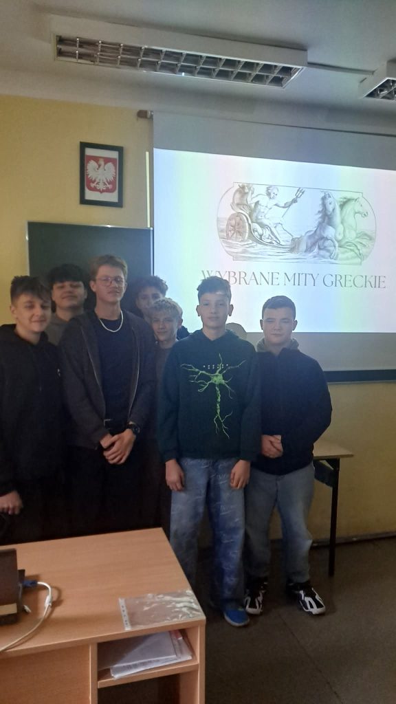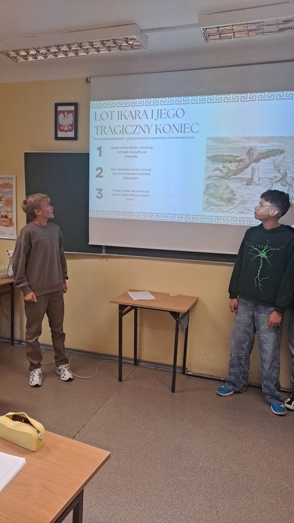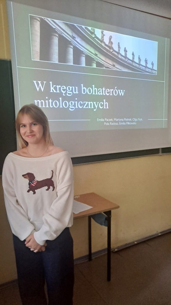 Klasa 1d1 zaprezentowała projekt „Lektury inaczej – Antygona”, w którym uczniowie wcielili się w bohaterów tragedii Sofoklesa. Przeprowadzili sąd nad tytułową bohaterką, próbując odpowiedzieć na pytanie: kto jest winien? Scenki przygotowane z ogromnym zaangażowaniem, oprawa muzyczna, kostiumy i rekwizyty pozwoliły lepiej zrozumieć dramat antyczny i wczuć się w emocje postaci. Efekt? Uruchomione pokłady kreatywności, lepsze zapamiętanie treści i nauka przez działanie! Również klasa 1d1 wzięła udział w interdyscyplinarnym projekcie „W kręgu bohaterów mitologicznych”, łącząc wiedzę z języka polskiego i technologii informacyjnej. Uczniowie, pracując w grupach, tworzyli materiały o wybranych mitach – wykorzystując aplikacje komputerowe, plakaty, filmiki, mapy myśli czy metaplany. Druga część projektu to prezentacje na forum klasy, które połączyły twórcze działanie z wykorzystaniem TIK. Dzięki temu uczniowie doskonalili współpracę, kreatywność, umiejętność organizacji i samodyscyplinę.