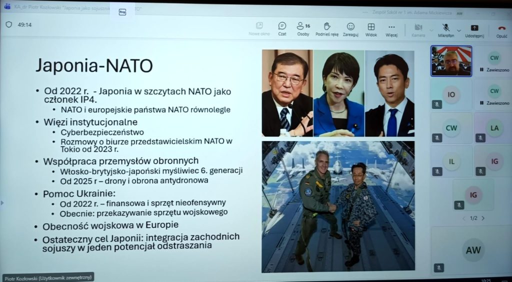7 listopada uczniowie wysłuchali webinaru „Japonia jako sojusznik państw NATO”, podczas którego poznali współczesną rolę Japonii na arenie międzynarodowej, jej relacje z państwami Zachodu oraz wyzwania stojące przed polityką bezpieczeństwa w regionie Azji i Pacyfiku.