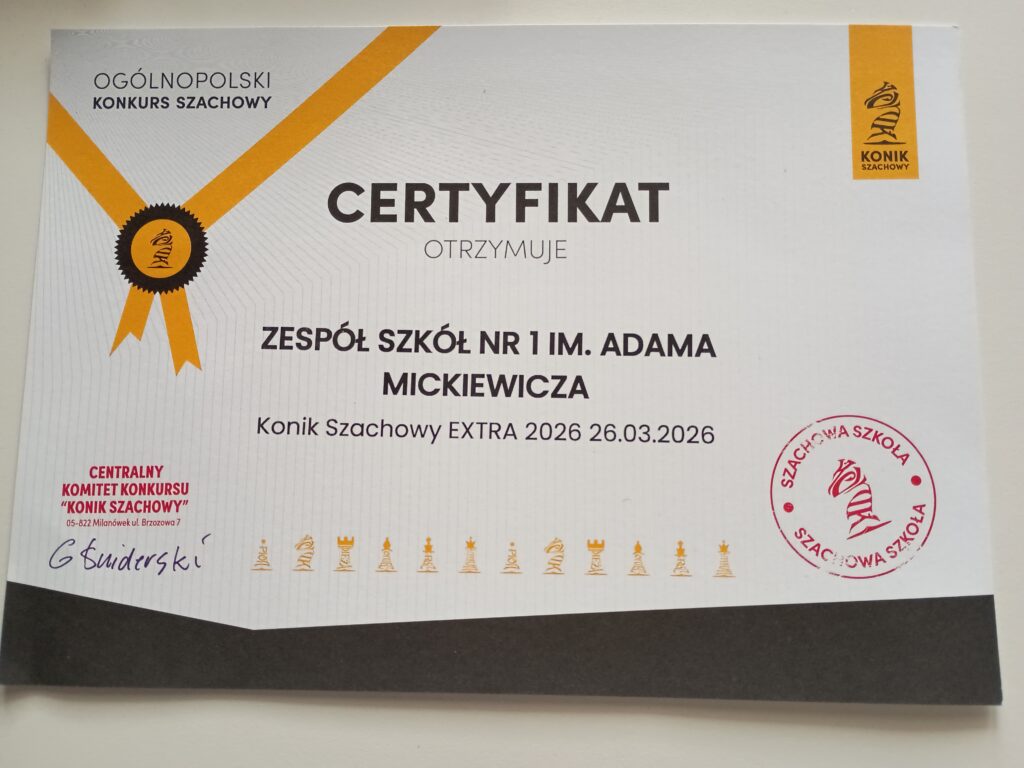 W dniu 26 marca 2026 r. 17 uczniów naszego liceum wzięło udział w wiosennej edycji Ogólnopolskiego Konkursu Szachowego „KONIK SZACHOWY EXTRA”. Konkurs polegał na rozwiązaniu 30 zadań szachowych o różnym stopniu trudności. Maksymalnie można było zdobyć 120 punktów. Uczniowie, którzy uzyskali najwyższe wyniki to: – Piotr Gansiniec (kl. 2D) – 96 punktów i uzyskanie tytułu…
